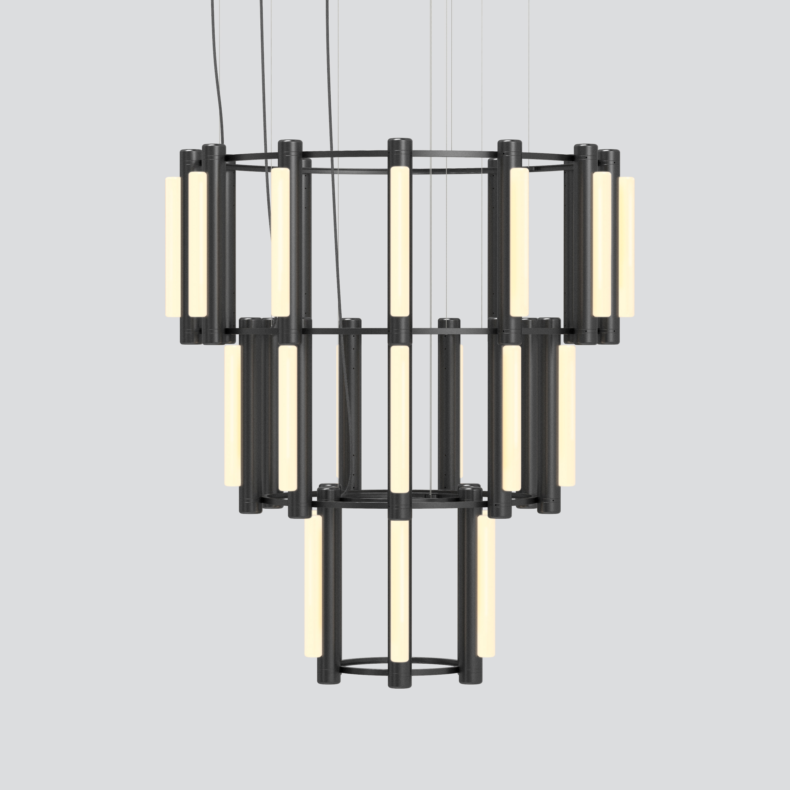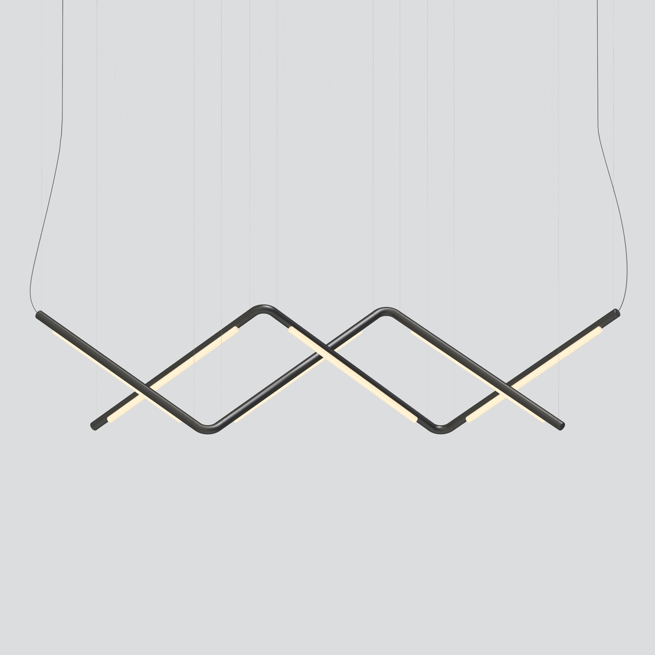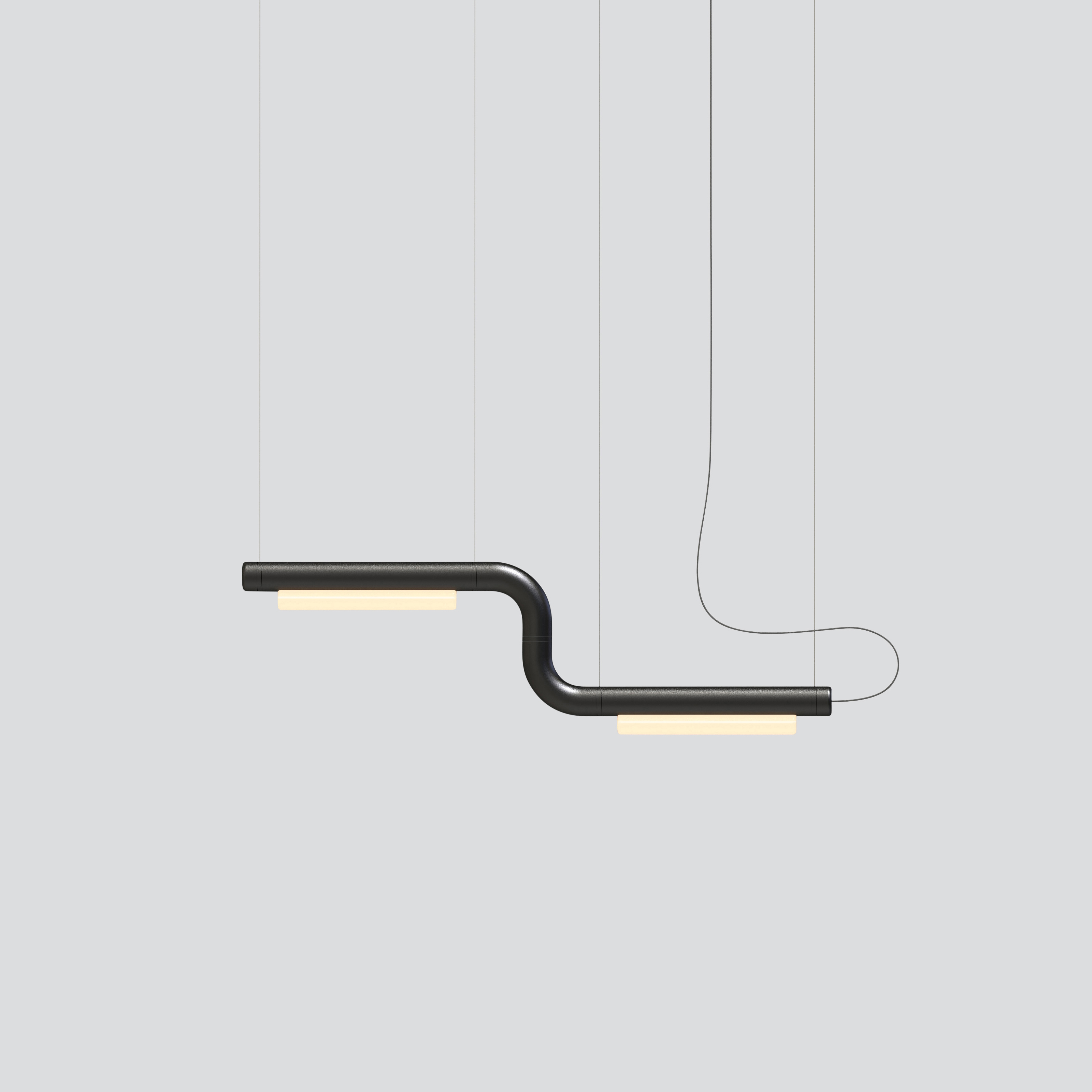 The Pipeline pendant may suspend horizontally level or at an angle, individually or plurally and within the space it inhabits.